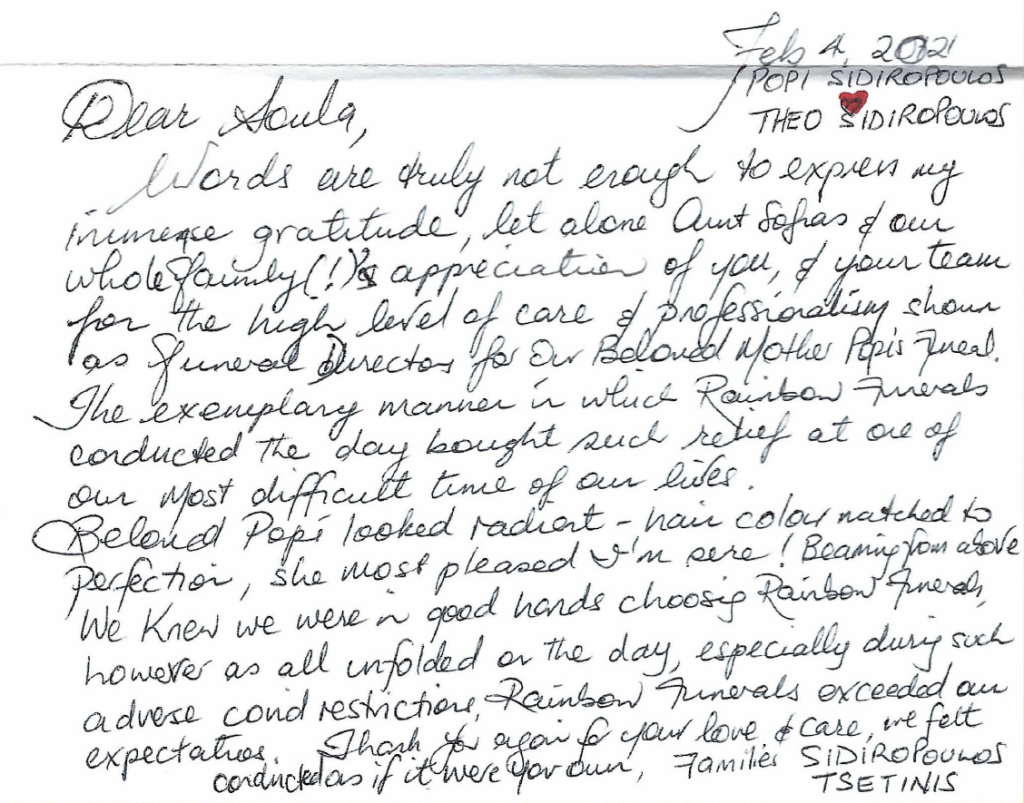 “Soula from Rainbow Funerals has been nothing short of amazing. From the first phone call Soula made us feel at ease during an incredibly difficult time. She listened to our concerns and requests and answered our questions with understanding. I know my Uncle would have truly appreciated the respect and care she and her colleagues showed for him during his final journey. Our family thanks you Soula, for being so wonderful! It has meant so much to all of us.”